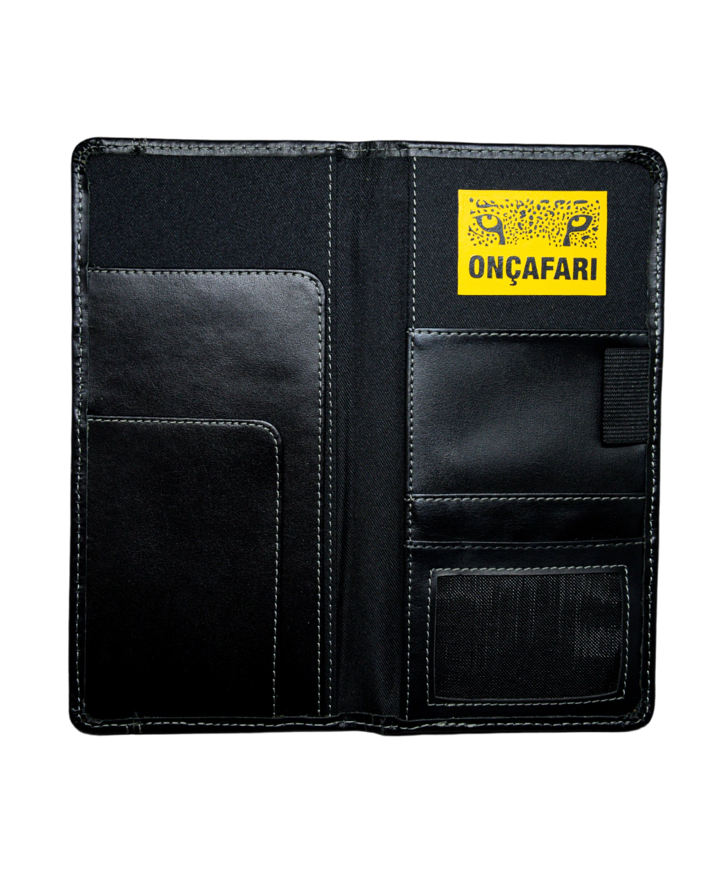 Pratique estilo e apoio à conservação da vida selvagem com esta carteira passaporte em couro sintético preto, estampada com o logo do ONÇAFARI. Compacta, possui espaço para passaporte, cartões e documentos.